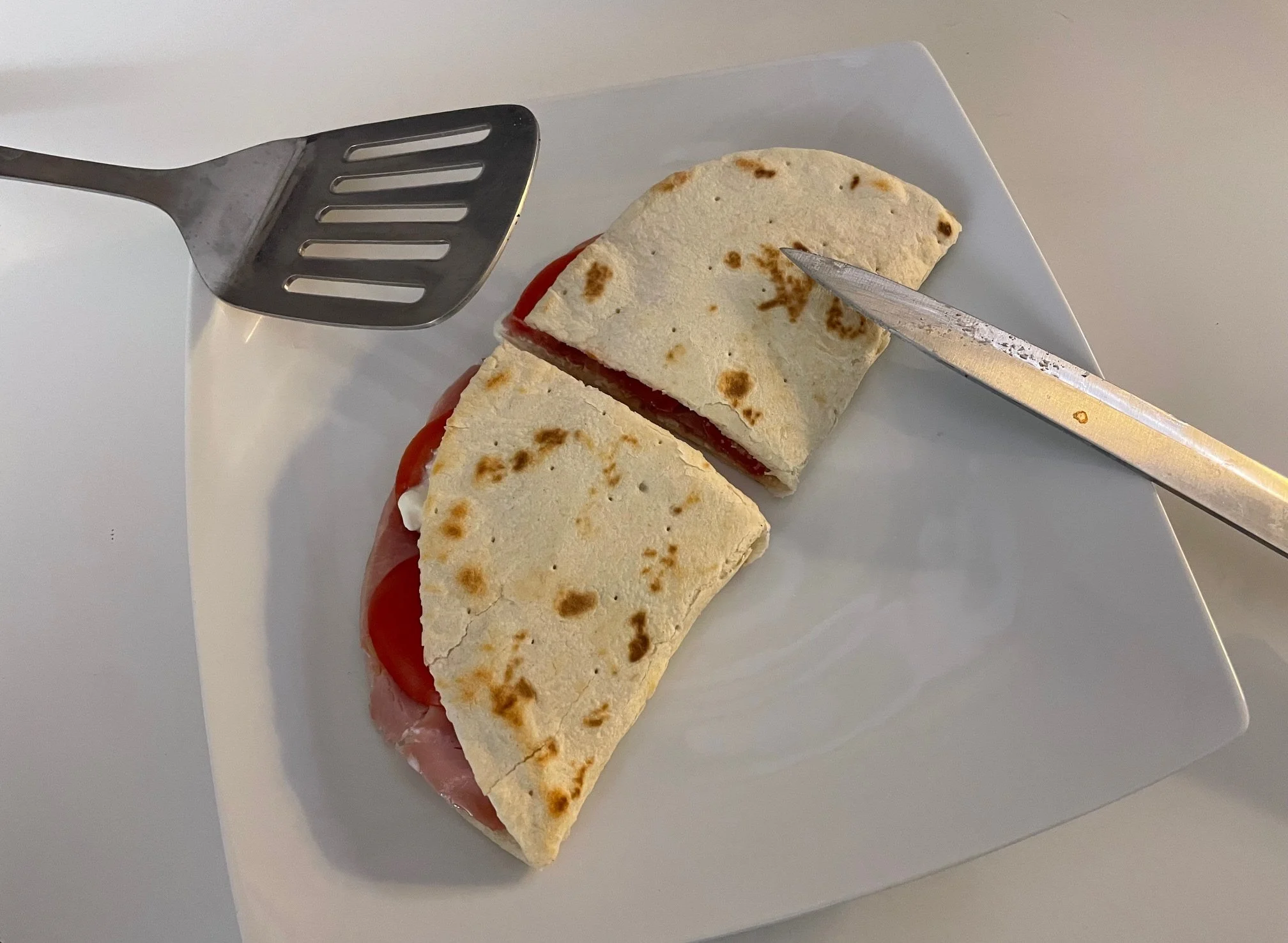 There is nothing better when you come home after an evening with friends. Maybe you were late, you drank, or rather, you drank :-)!! So, you wonder... where does that desire to bite something come from?!? It works like this: you take the piadina, heat it slightly, add the (secret) cheese, cooked ham, thinly sliced tomatoes and off you go... that's it. You can eat it all!! At that point you decide it's time to go to bed, but first..?? Mac, the only thinking being now, you rely on him to immortalize the moment. Good night!
